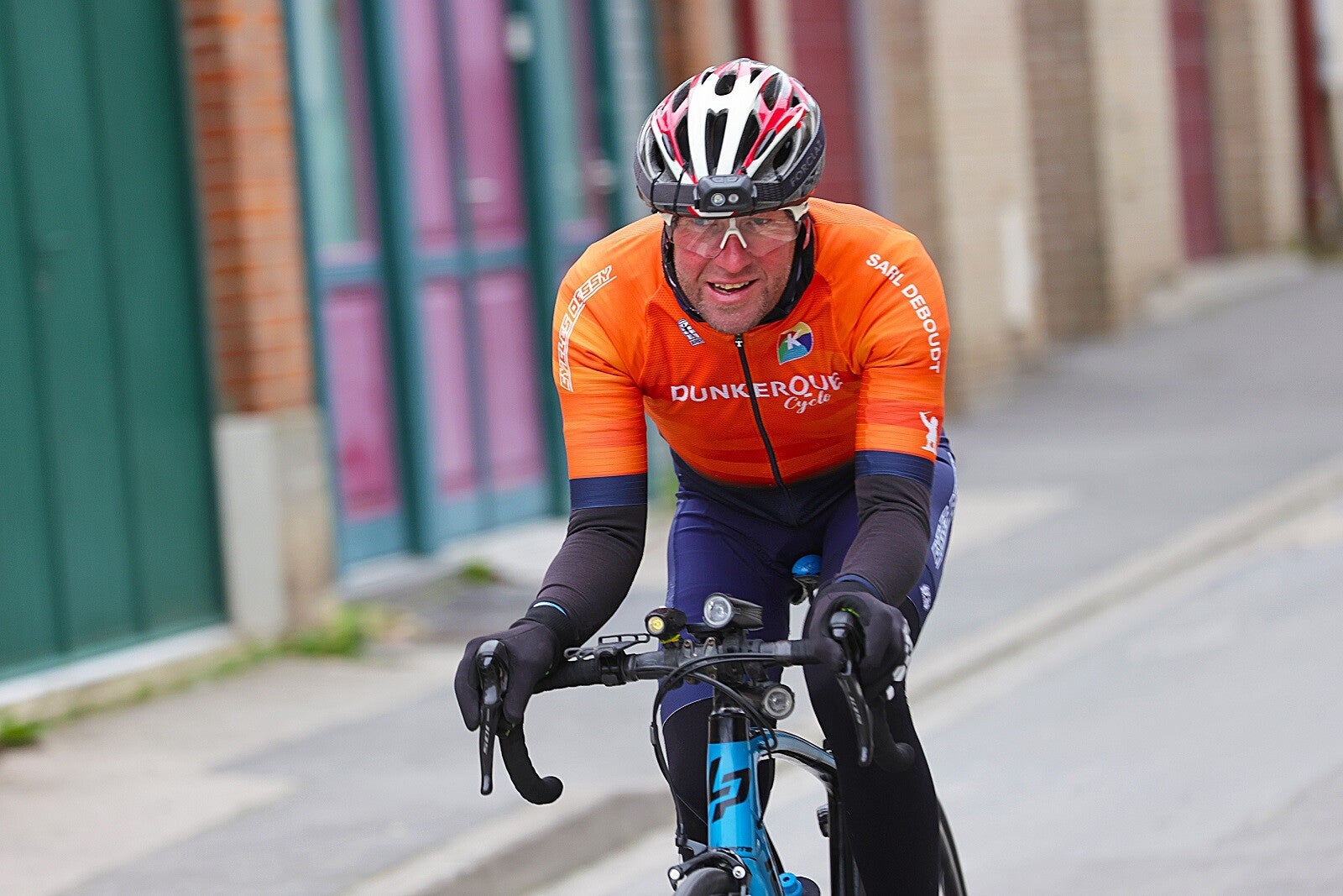 Vers 12 h, arrivé de la balade cyclo accompagné de Stéphane Plancke quinquagénaire atteint de myopathie des ceintures, plus précisément de calpaïnopathie, prévoit de relier à vélo Bergues à Carentan.
